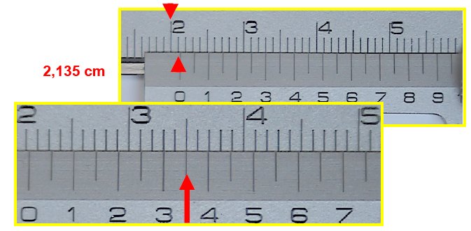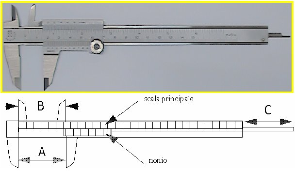 Calibro Lo strumento ha una parte fissa ed una scorrevole e, mediante due sistemi di ganasce e un codolo,permette di eseguire misure esterne (A), interne (B) e di profondità (C). Sulla parte fissa è riportata una scala (principale) con tacche ogni millimetro; la parte mobile è solidale con un nonio solitamente ventesimale (decimale nei modelli più economici, cinquantesimale in quelli più precisi). ![]() Consideriamo il nonio ventesimale dei calibri in dotazione al Laboratorio. In essi a 39 divisioni della scala principale D (da 1 mm) corrispondono 20 di quelle della scala secondaria: 39 D = 20 d. ![]() Per costruzione, se il nonio, che è solidale con la parte scorrevole del calibro, viene spostato verso destra di una quantità d si osserverà la coincidenza della prima tacca del nonio con una (la seconda) della scala principale.Se invece il nonio si sposta di 2 d allora sarà la seconda tacca del nonio a coincidere con una della scala principale e così via: se a coincidere con una delle divisione della scala fissa è l' n-sima divisione del nonio, ciò significa che esso (e quindi le ganasce e il codolo) sono stati spostati della quantità n d. Il nonio viene graduato in modo tale che sia d = 2 D - d cioè d = 2 D - 39/20 D = D/20 = 50 µm !!! Con il nonio abbiamo ottenuto un'amplificazione della scala e siamo in grado di apprezzare un ventesimo della divisione della scala principale. Per comodità sul nonio non sono riportati i valori per tutte le tacche ma solo ogni 2 tacche: 2 divisioni corrispondono a 100 µm cioè un decimo di millimetro e alla lettura (in millimetri) della scala principale basta aggiungere i decimi di millimetro letti sulla scala riportata sul nonio. A volte non si riuscirà a decidere se la coincidenza è fra una tacca del nonio o la successiva: si assumerà il valore intermedio come risultato della lettura (in questo strumento non ha senso parlare di lettura al decimo di divisione).Supponiamo di eseguire una misurazione e di trovare il nonio nella posizione indicata nella foto. L'indice da utilizzare per la lettura sulla scala principale è dato dalla tacca 0 del nonio. Si legge una quantità leggermente superiore a 2,1 cm; il nonio serve per valutare questo eccesso. Come si vede nella foto in basso la tacca del nonio che meglio corrisponde a una qualsiasi tacca della scala principale ha l'indicazione compresa fra 3 e 4: si leggono 3,5 decimi di millimetro (0,035 cm). Quindi la lettura complessiva è 2,1 cm + 0,035 cm = 2,135 cm. ![]() L'amplificazione del nonio è lecita solo se la precisione dello strumento lo consente: dovendo apprezzare i 50 µm, lo scorrimento del cursore, il parallelismo fra le ganasce, la leggibilità delle tacche e la precisione delle divisioni dovranno essere tali da introdurre errori inferiori alla decina di micron. A questi livelli può non essere trascurabile la differenza fra la dilatazione termica dell'oggetto da misurare e quella dello strumento: la misura di un oggetto lungo 20 cm a 20°C risulta più grande di circa 10 µm se eseguita a 30°C. Va infine prestata attenzione alla durezza del misurando per ridurre/correggere l'effetto dell'errore di inserzione. Manuale d'uso: Esperienze correlate: sezione meccanica |