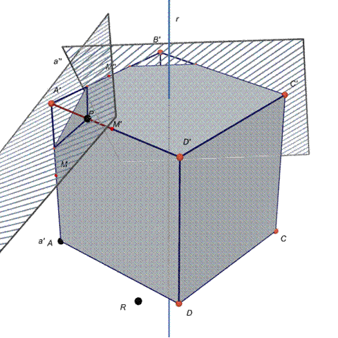 Per determinare in modo veloce il piano passante per i punti medi degli spigoli concorrenti in B’, notiamo che la rotazione intorno alla retta r (che è perpendicolare alla faccia ABCD del cubo e passa per il centro O’ della faccia) che porta il punto A in A’, porta il cubo in se stesso.