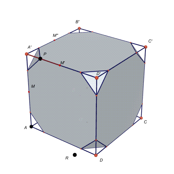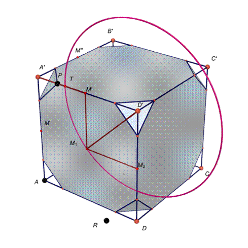 Se muoviamo il punto P da A’ a T, e poi da T a M’, passiamo con continuità dal cubo, al cubo tronco e infine al cubottaedro.
